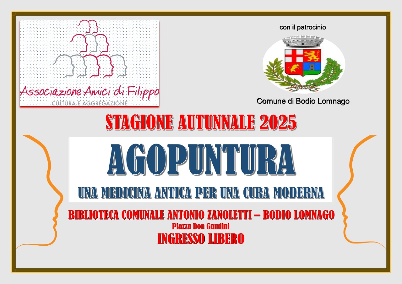 Venerdì 19 settembre 2025 alle ore 21:00, la Biblioteca Comunale “Antonio Zanoletti” di Bodio Lomnago ospiterà un incontro aperto al pubblico dedicato all’agopuntura. L’appuntamento, a ingresso libero, fa parte della rassegna culturale “Stagione autunnale 2025”, promossa dall’Associazione Amici di Filippo con il patrocinio del Comune di Bodio Lomnago.