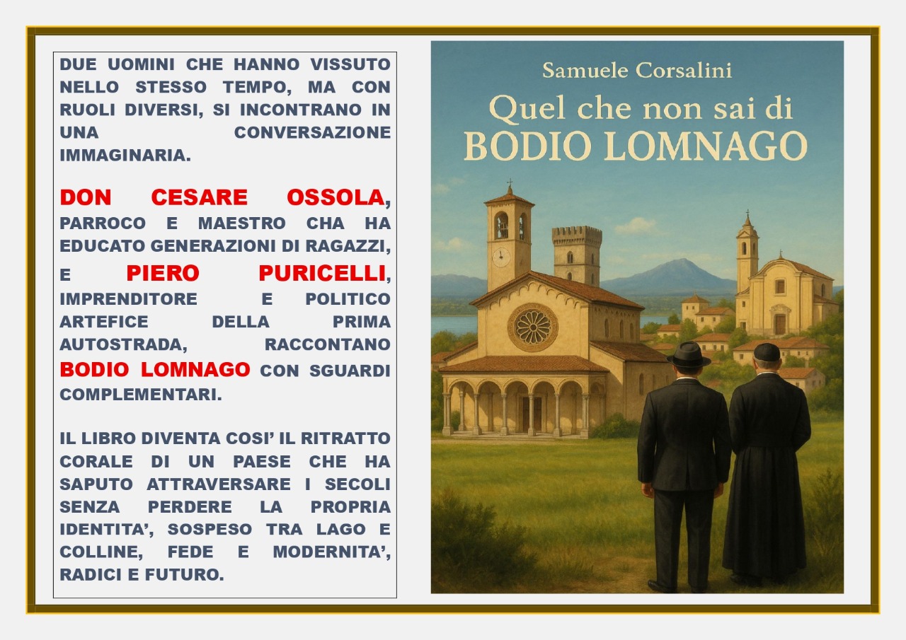 Nel suo nuovo lavoro, Corsalini propone un originale dialogo immaginario tra due figure emblematiche del paese: Don Cesare Ossola, storico parroco e maestro che ha formato intere generazioni, e Piero Puricelli, imprenditore e politico noto per aver realizzato la prima autostrada al mondo. Due visioni complementari — quella comunitaria e spirituale da un lato, quella istituzionale e legata al progresso dall’altro — si intrecciano per raccontare la storia di Bodio Lomnago da prospettive diverse ma ugualmente profonde.